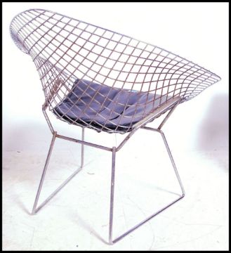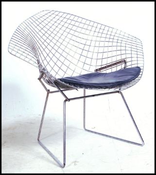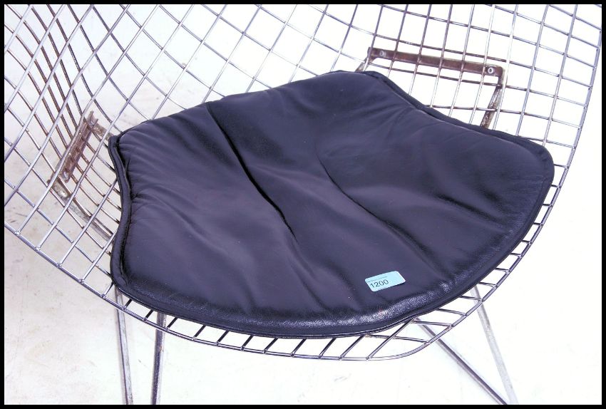 A believed original mid century Harry Bertoia wirework ' Diamond shape' chair of typical form, possibly manufactured by Knoll. The chair having well constructed frame.the chrome tubing being well chamfered the edges, the base united to the frame with hex-bolts. Finished with a black leather seat pad