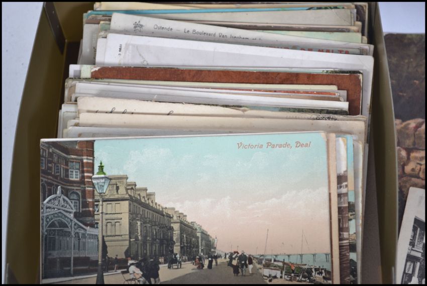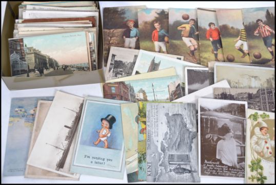 Original single family postcard collection (127) All postally used to same addressee. Good selection of topographical/subject. Inc 1910 Football set (6), Shipping, Comic/Greetings, Patriotic WWI, Actresses & many street scenes. Nearly all British.
