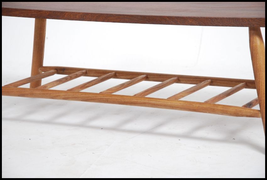 A mid 20th century teak top coffee table having a lower spindle magazine rack. with rectangular top above. Measures 33cm high x 108cm wide x 39cm deep.
