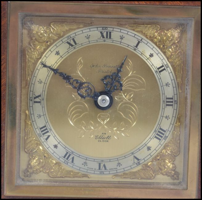 A good quality 20th century mahogany cased mantel clock by Elliott having retailers notation to centre for John Bennett of Bristol. Measures 15cm high.