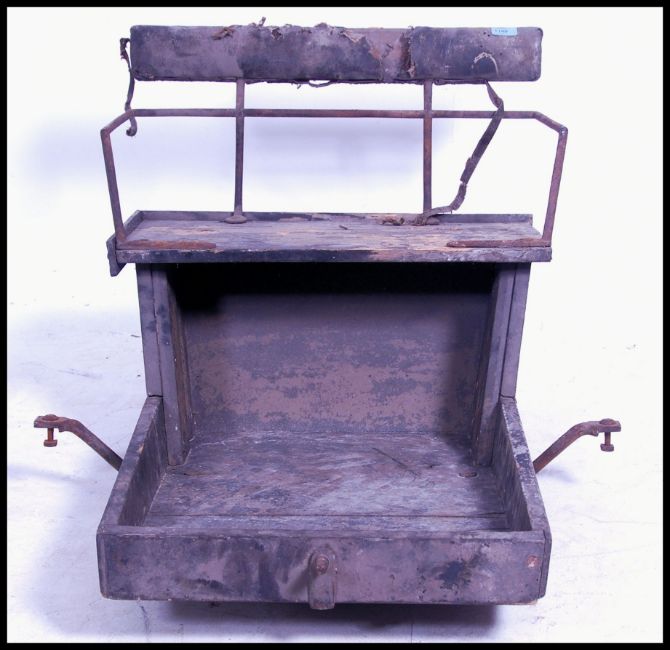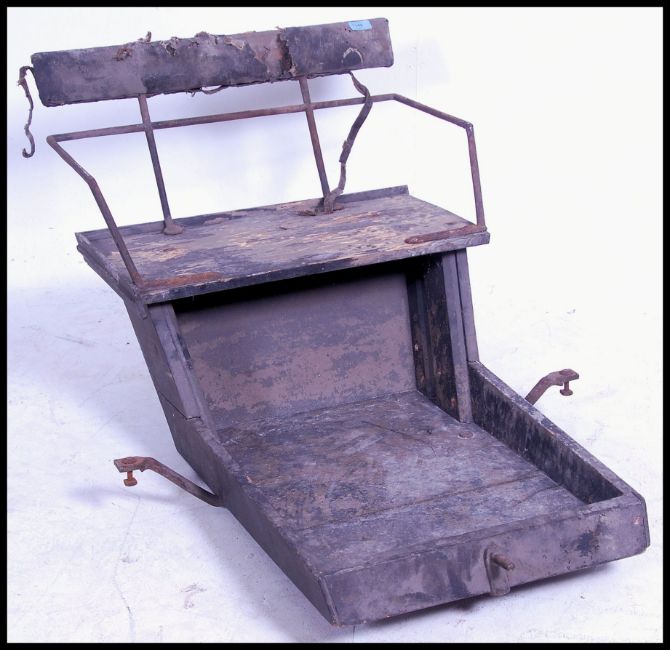 An early 20th century seat section from a horses cart / trap. Having an over stuffed leather seat pad. Please see images. Measures 53cm high x 62cm wide x 100cm deep.