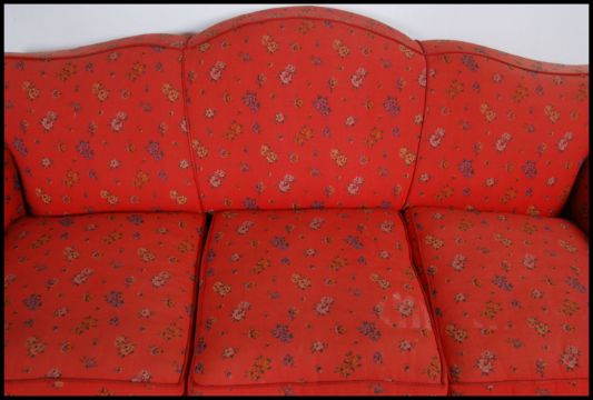 A stunning 1930's Art Deco club 3 seat sofa settee. Of French origin, the large sofa with stunning shaped armrests and moustache shaped back being upholstered in a vibrant red fabric. Matching 2 club armchairs in lot 1371