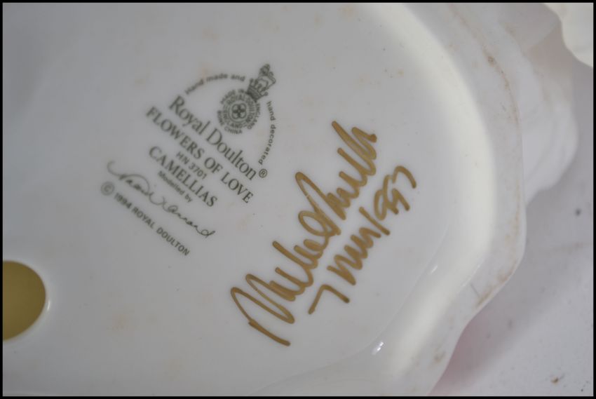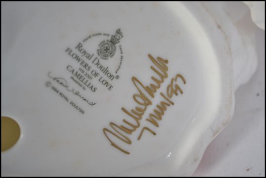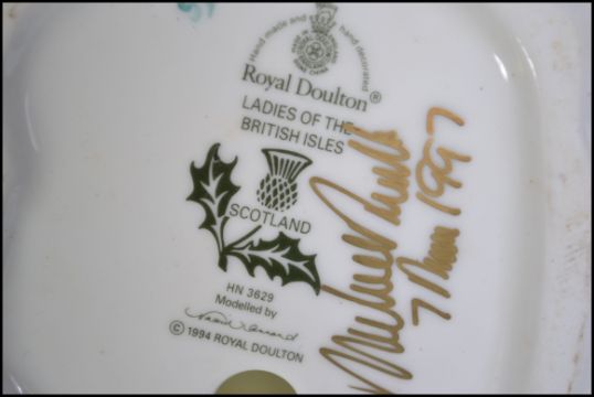A collection of Royal Doulton figurines to include Ladies of the British Isles Scotland & England HN3629 & HN3627. Also Flowers of Love Camellias HN3701 & April HN3693. The tallest measures 21cm high.