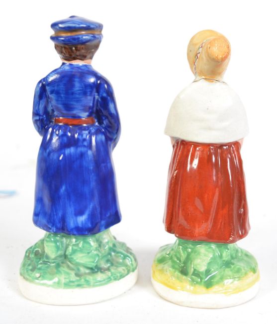 A pair of Victorian Staffordshire figures of a girl and boy, the bases inscribed Red Maid Bristol ( Early Repair ) and Colston Boy Bristol. Local interest, these figures depict the uniforms worn at The Red Maids and The Colston Schools in Bristol. Both schools were funded to care for the poor and orphaned.