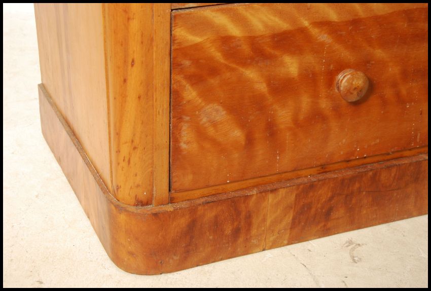 A Victorian satin birch 2 over 3 chest of drawers being raised on a plinth base with 2 short over 3 deep configuration having knob handles to the drawers. Measures 110cm high x 120cm wide x 49cm deep.