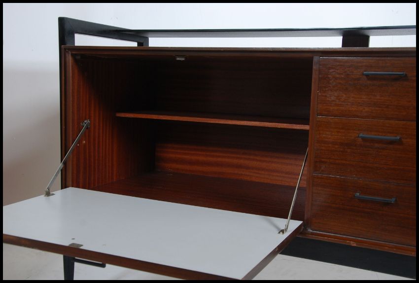 A vintage mid 20th century rosewood sideboard by Wrighton.  Having a smoked glass shelf over a run of three drawers next to a full front cupboard with shelved interior. Raised on ebonised tapered supports united by stretchers.