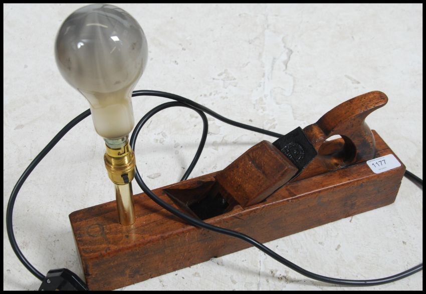 An early 20th century Industrial wood working box plane having a later conversion into a table lamp / light.