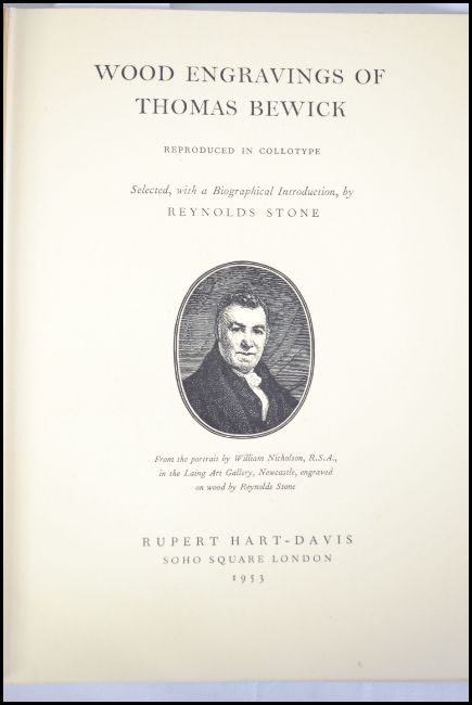 Book; Wood Engravings Of Thomas Bewick; Reproduced In Collotype; by Reynolds Stone. Pub; Rupert Hart - Davis, London, 1953. Limited edition. In brown cloth with gilt titles on spine in unclipped grey dust jacket with red and black titles. No.842 of a limited edition of 1000. Rare.