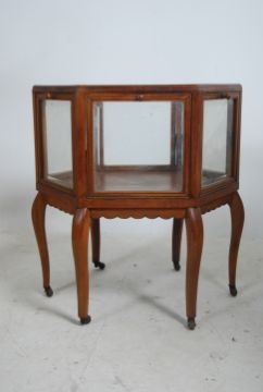 An early 20th century mahogany bijouterie drum table display cabinet. The table being raised on shaped legs with brown ceramic castors. Above a hexagonal drum table cabinet with fall front doors to the sides. Measures 70cm high x 63cm wide x 66cm deep.