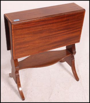 An Edwardian mahogany inlaid sutherland table. Raised on squared supports with shaped drop leaves having inlaid borders. Measures(cm) Height 67 x Width 58 x Depth 35.