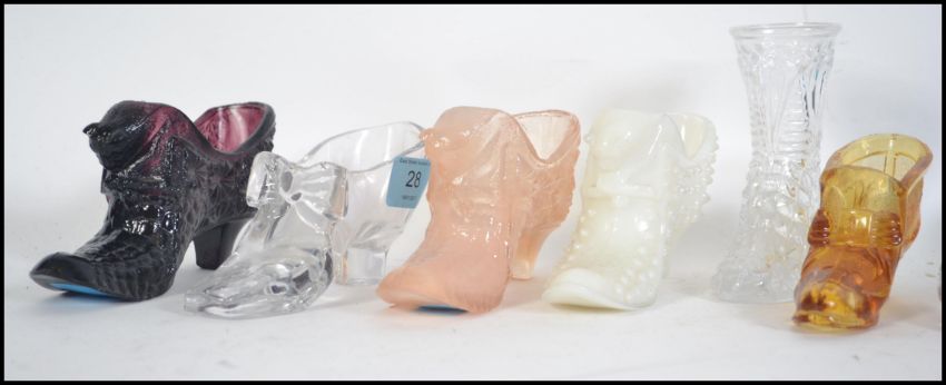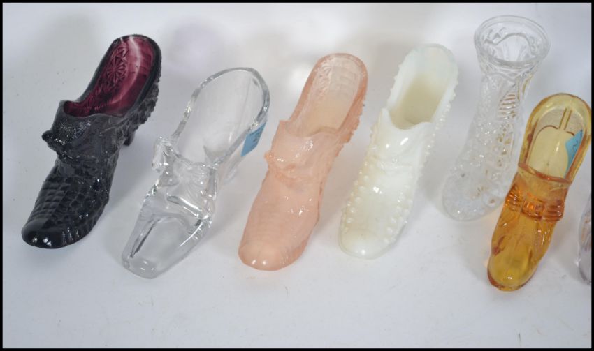 Twelve novelty pressed glass ladies shoes / boots of varying styles and ages Measures 10cms high.