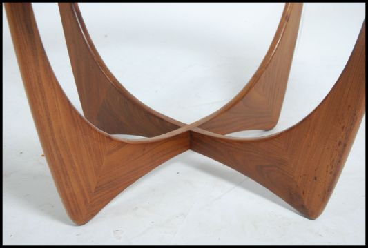 A vintage mid 20th century G Plan atomic teak wood round coffee table with drop in glass centre raised on atomic teak legs. Measures 46cm high x 85cm wide x 85cm deep.