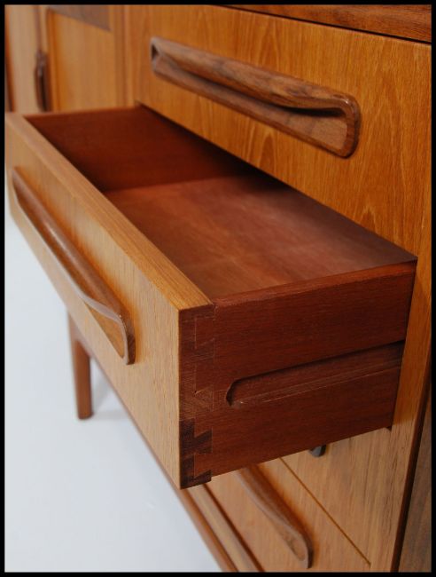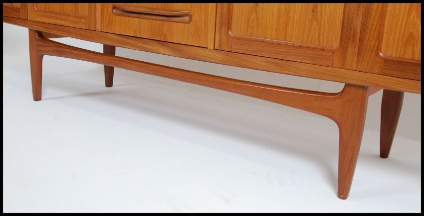A reto 1970's G-Plan teak wood sideboard, with a bank of four central drawers flanked both sides by double cupboards, approximate size length 213cm x depth 46cm x height 79cm