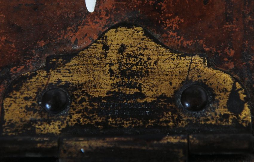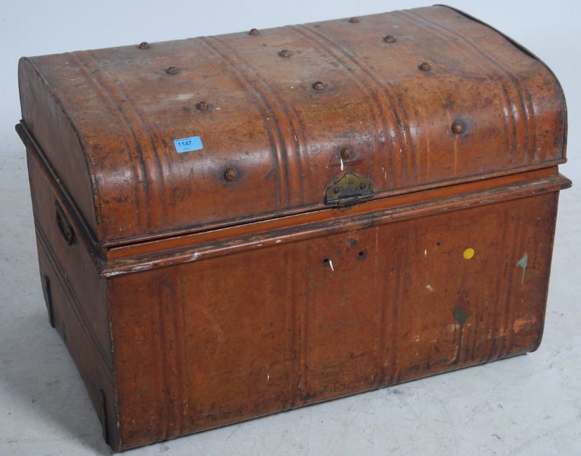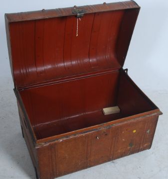 A late 19th century Victorian tin travelling trunk with original wood grained finish, brass lock plate and clasp.