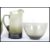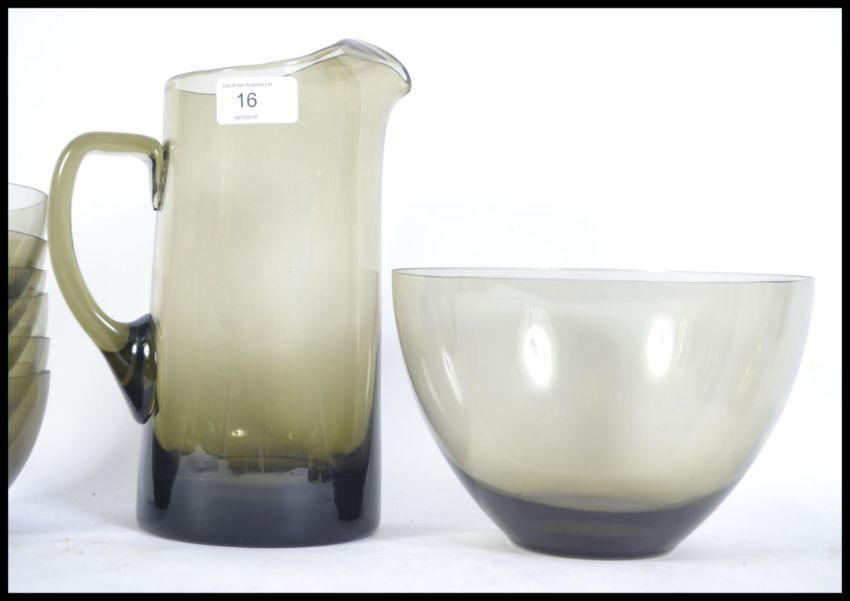 A good retro Scandinavian style lemonade set consisting of a ewer jug  and six glasses in smoked glass along with a matching dessert set in the same pattern with serving bowl and six bowls. No chips or cracks. 25cms high