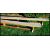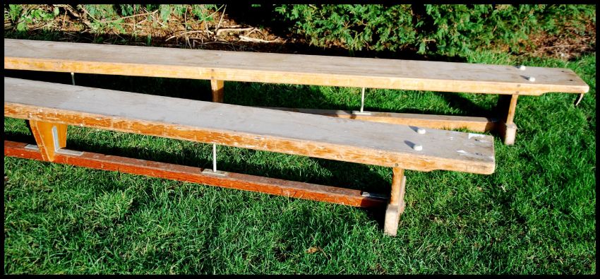 A pair of retro 1970's long school - military gym benches. Long planked form with upright supports united by stretchers. Military markings with crows foot to underside