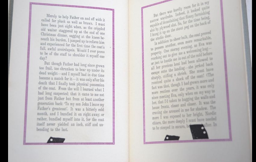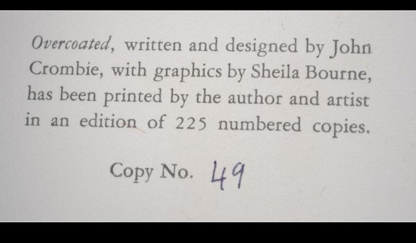 John Crombie & Sheila Bourne; Overcoated. Pub John Crombie, Paris, 1982. Limited edition. 49/225. Grey softcovers with black titles. Sixteen fold out pages with illustrations on each. Rare.