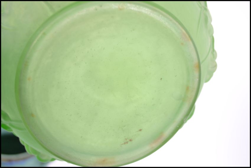 An unusual and handpainted drop glaze twin handled vase with numbers to the base having peacock feather decoration together with a green Loetz style glass vase. The tallest measures 26cm high.