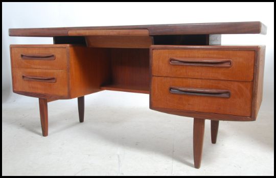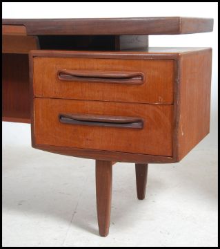 A 1970's G-Plan Fresco pattern teak wood writing table desk having a series of drawers with recessed handles and suspension set top. Measures: 73cms high x 145cms wide x 46cms deep.