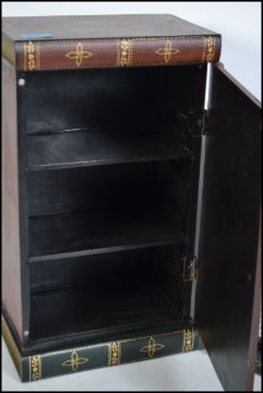A pair of contemporary storage units in the form of stacks of books. Hinged door opening to reveal shelved interior. The tallest measures 50cm high.