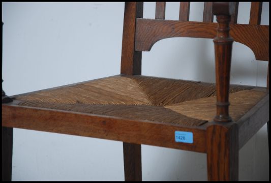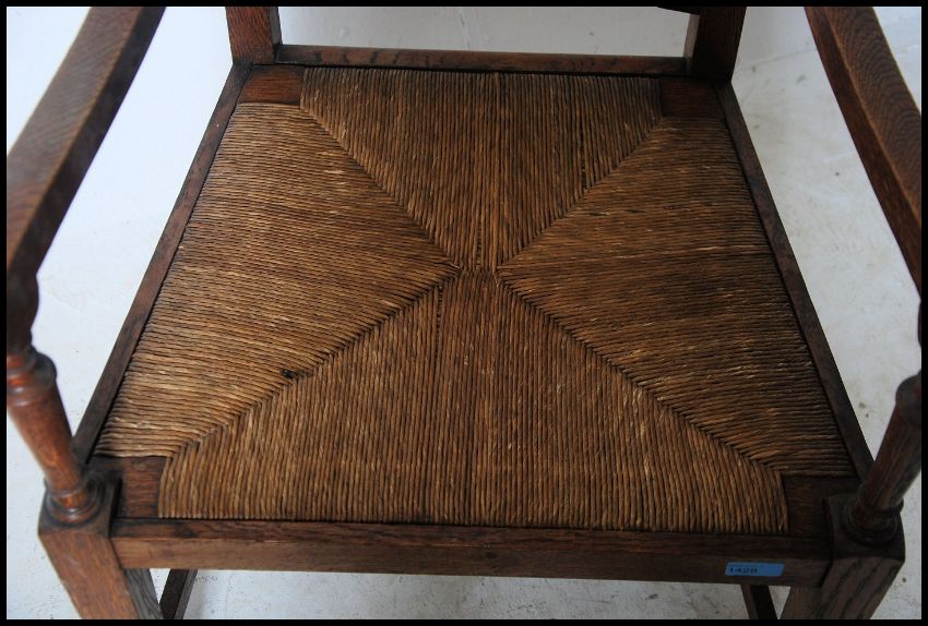 A Victorian Arts & Crafts rattan weave carver armchair in the manner of Liberty. The chair being raised on square tapering legs with rattan weave seat and railed back rest