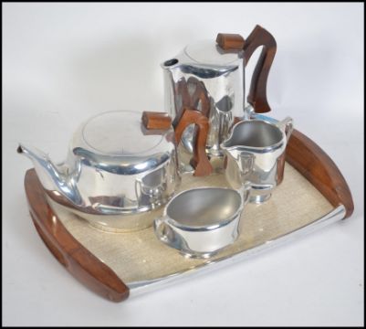A retro 20th century Piquot Ware five piece tea and coffee service consisting of teapot, coffee pot, creamer, sugar bowl and serving tray. Stamped to the base. The tray measures 39cm wide.