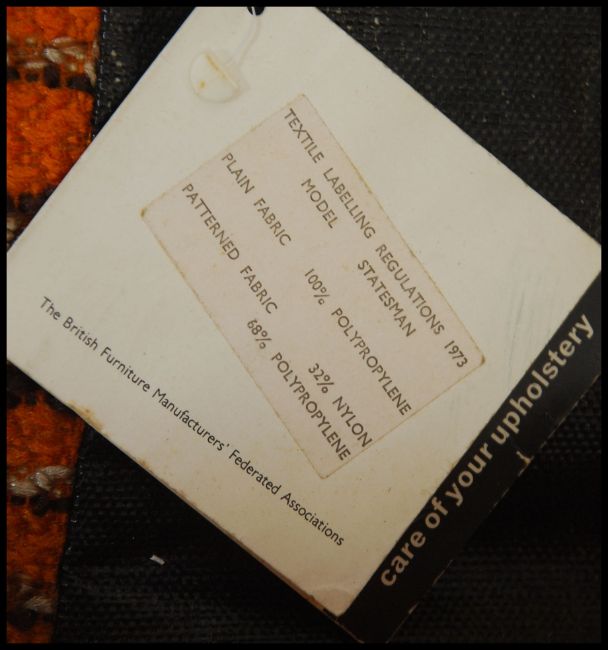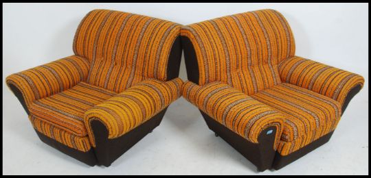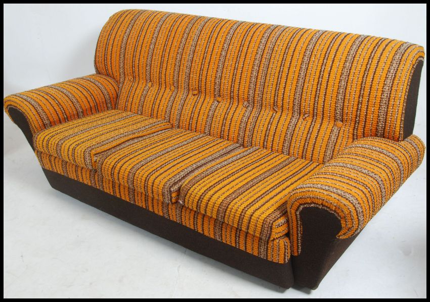 An original 1970's retro 3 piece suite - sofa and 2 armchairs. The suite in the original vivid fabric being well shaped retaining original label. The suite known as ' The Statesman ' 1972. Measures 80cm high x 186cm wide x 86cm deep.