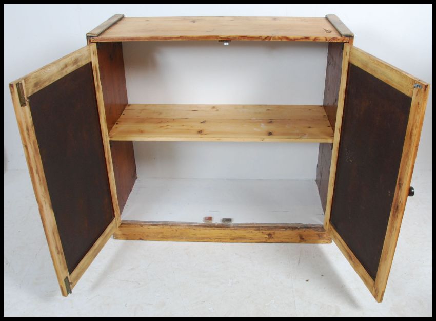 An early 20th century Industrial waxed pine school cupboard with twin doors enclosing a shelved interior within. Measures: 103cms high x 107cms wide x 44cms deep.