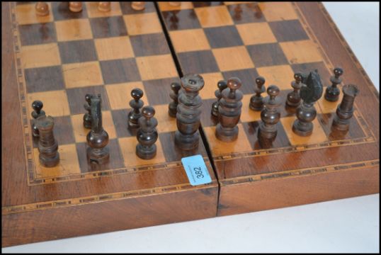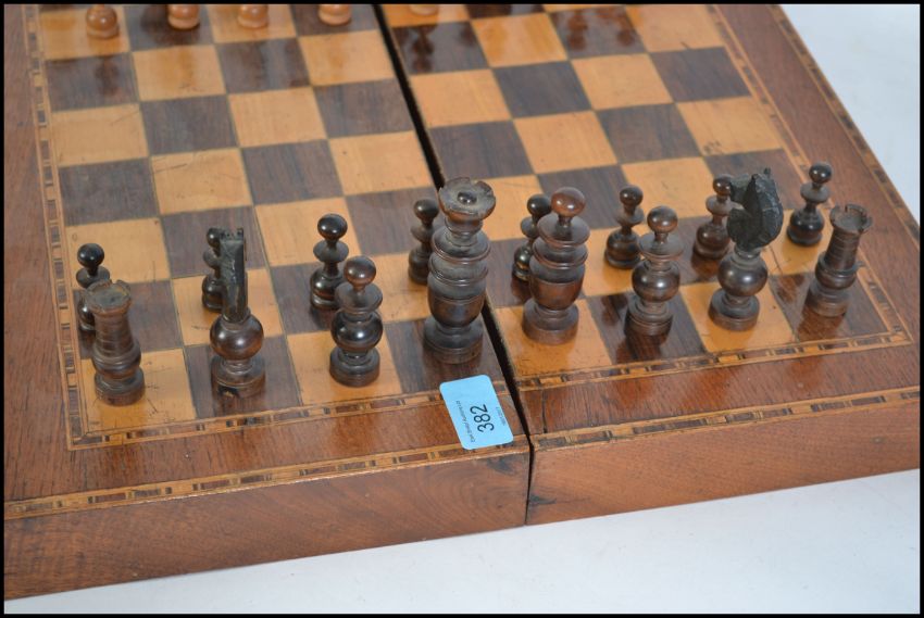 An early 20th century  large mahogany and tunbridge inlaid chess board box complete with chess pieces inside. ( see illustrations )