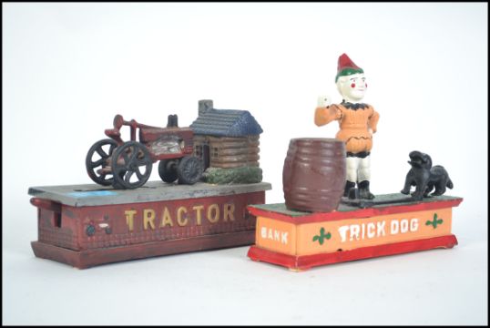 2 vintage style cast iron painted money boxes to include trick dog and tractor. Each with notation having sprung movement actions. Measure 21cms wide.