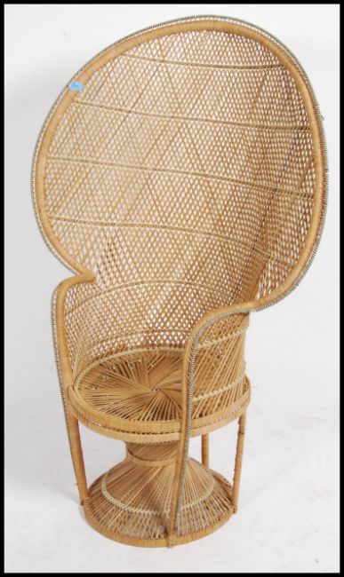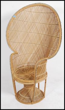 A vintage 20th century retro wicker peacock armchair with a large open back and woven seat. Measures 130cm high x 90cm wide x 50cm deep.