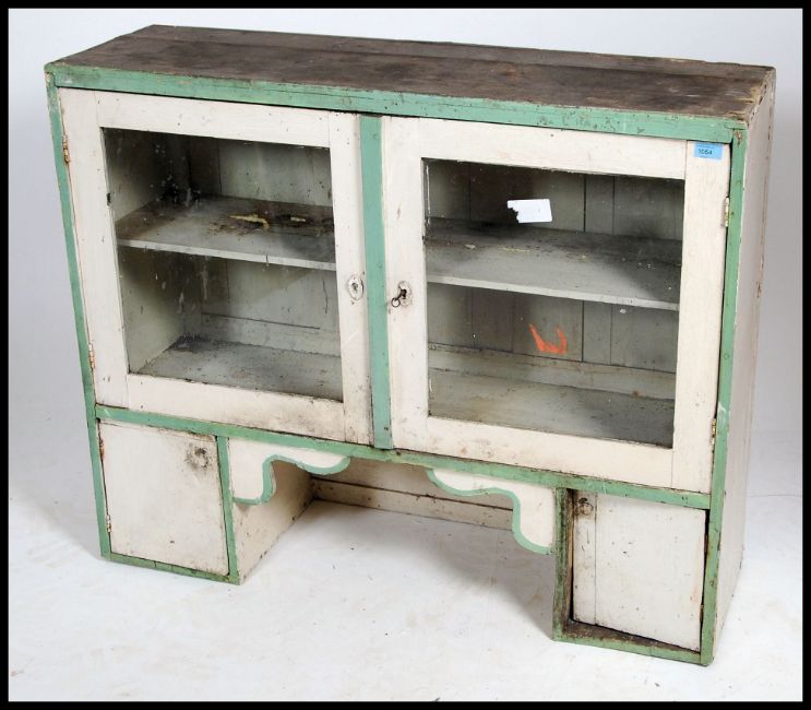 An early 20th century shabby chic painted two tone pine dresser top having an arrangement of cupboards and shelves. Measures 89cm high x 108cm wide x 34cm deep.