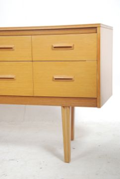 A retro 1970's mid century natural oak sideboard having tapered legs with a wide bank of 6 drawers having central recessed handles