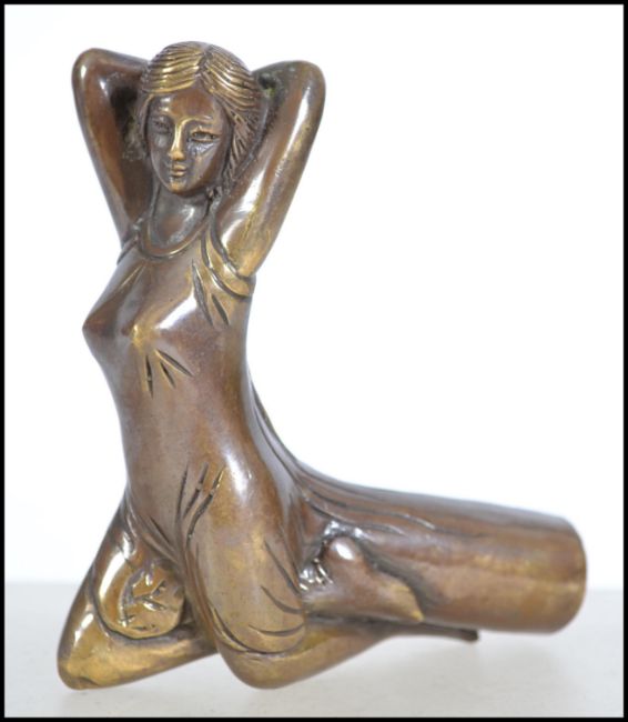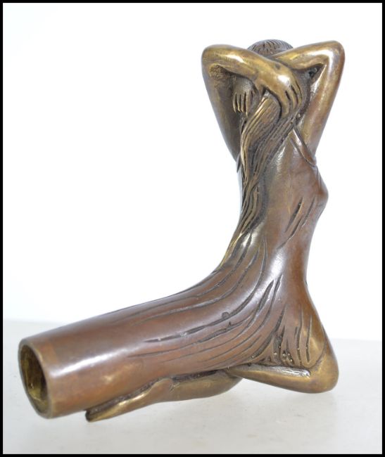 A decorative 20th century brass walking cane handle in the form of an Art Deco lady. Measures 11cm high.