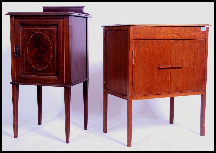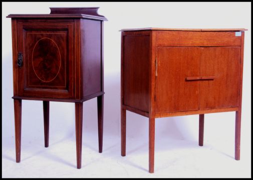 An Edwardian mahogany inlaid pot cupboard being raised on square tapered legs having single locker door with flared top above and stage gallery back. Together with a 1920's oak sewing box cabinet raised on squared legs. Measures 72cm high x 59cm wide x 36cm deep.