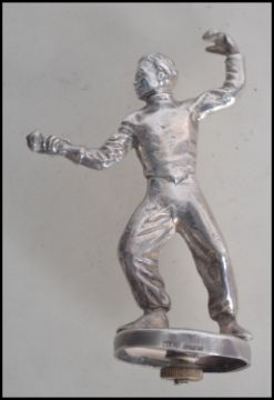 A silver hallmarked car mascot in the form of a fencer. Raised on a plinth base being marked for believed William James Dingley, Birmingham date letter N. Total weight 207.2g. Measures 11cm high.