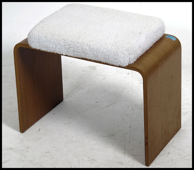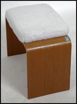 A retro 20th century bentwood dressing table stool being constructed from bentwood teak wood veneered support with a woolen padded seat pad. Measures 47cm high x 57cm wide x 31cm deep.
