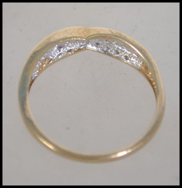 A hallmarked 9ct gold and diamond kiss crossover ring. Weight 2.6g. Diamonds approx 15pts. Size T.