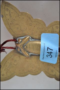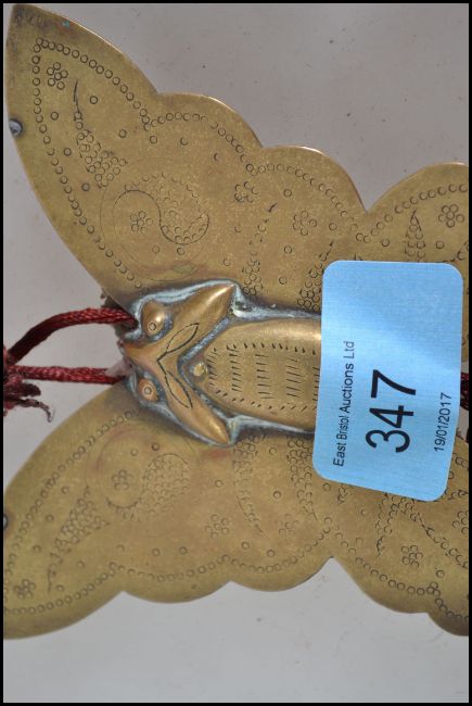 An Asiatic - Chinese 20th century unusual amber style bead string having a brass butterfly adorned to end with tassles. Measures 50cm long.
