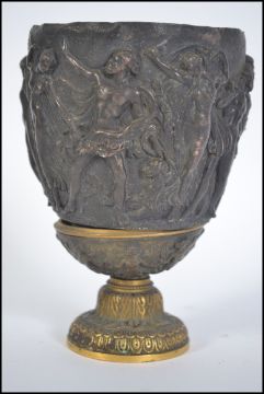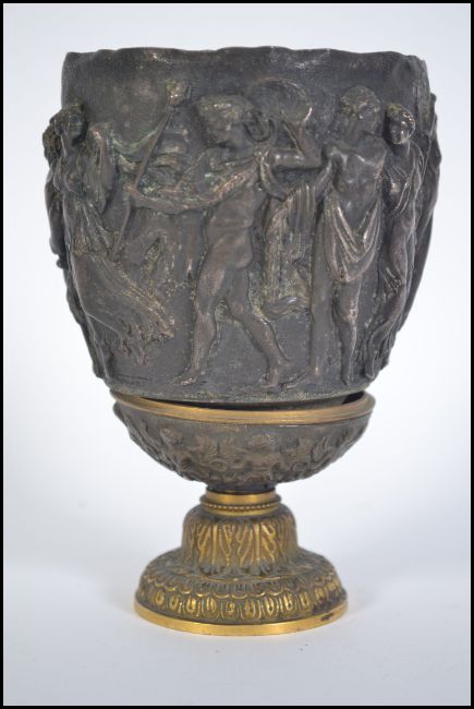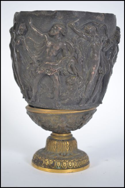 A 19th century Continental gilt metal and bronze neo - classical vessel goblet being cast in relief and  decorated with classical Greek like figures. All raised on a gilt column base. Measures 15cms high.