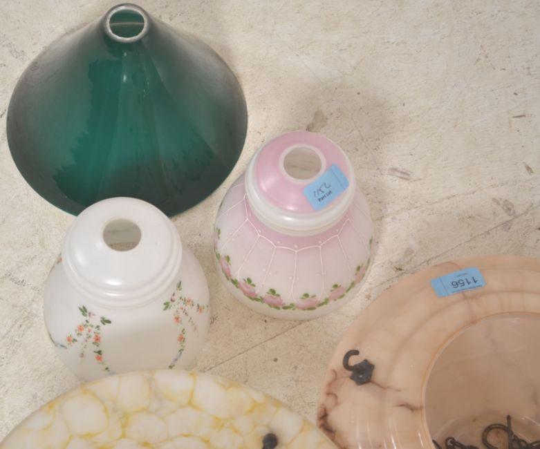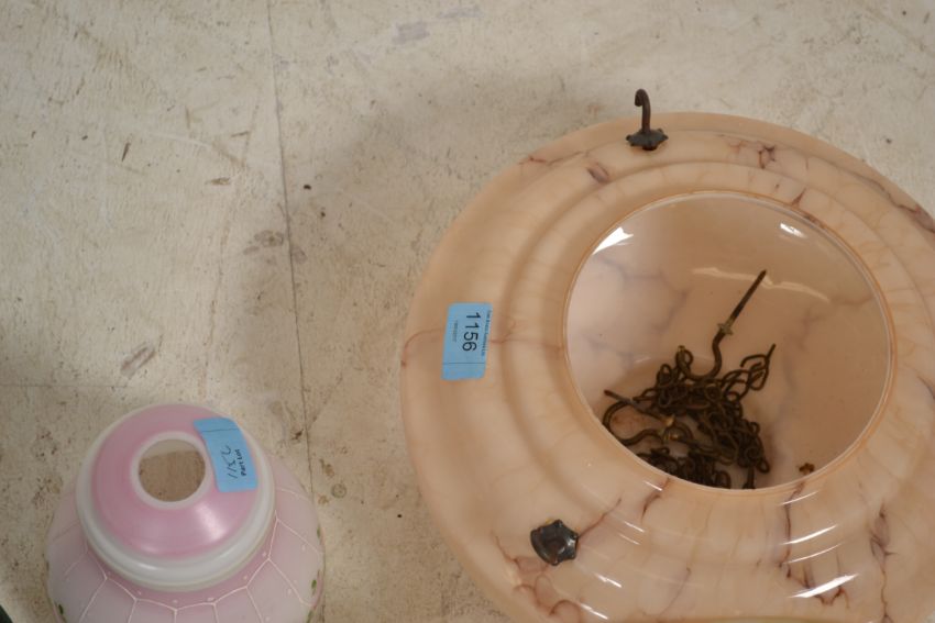 Two art deco glass ceiling lamp shades with hanging chains along with 3 other later glass shades one being a very modernist design.