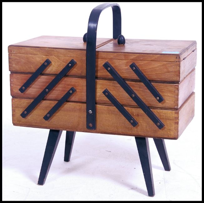 A 1950's mid century metamorphic sewing box with central handle over sectional outward moving body and raised on ebonised tapering supports. Measures 45cm x 43cm wide x 25cm deep.