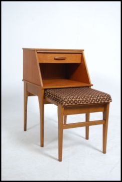 A 1970's retro teak wood Mr Chippy telephone table and chair combination being raised on tapered legs with single drawer and upholstered seat stool. Measures 69cm high x 42cm wide x 45cm deep.