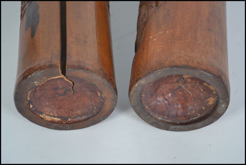 2 large 20th century Chinese bamboo brush pots of cylindrical form being carved in relief with scenes of villages / pagodas etc. Measures 36cm high.