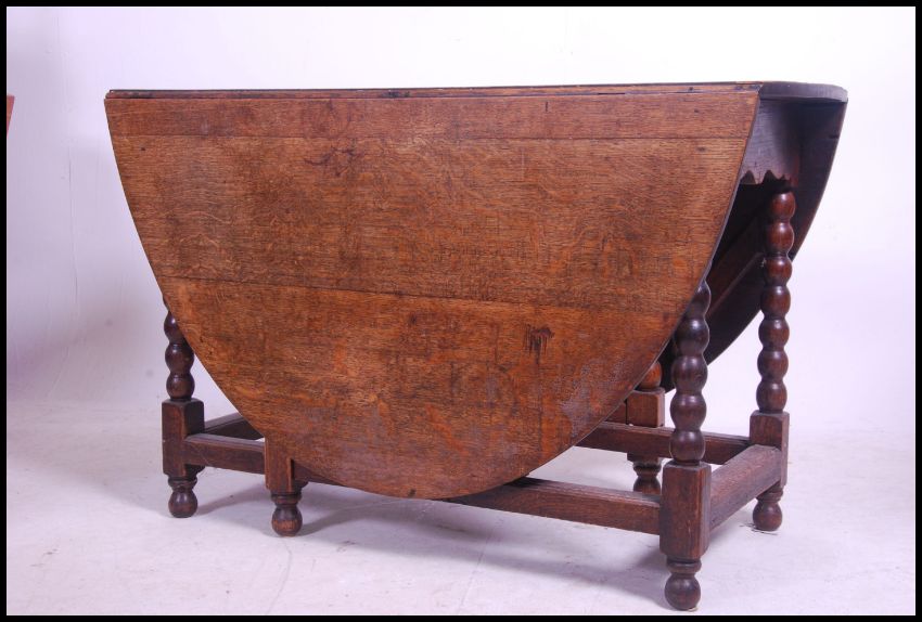 A 19th century carved country oak gate leg - drop leaf dining table raised on bobbin turned legs with oval drop leaves raised on a gate leg action. Measures 72cm high x 136cm wide x 114cm deep.