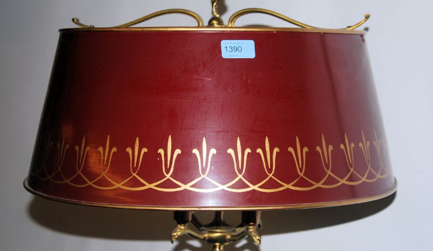 A  good 20th century brass standard coaching lamp raised on a tripod base with brass paw feet. The brass base with red lacquer decoration complete with shade and multiple bulb coaching lamp head. Measures 170cm high.