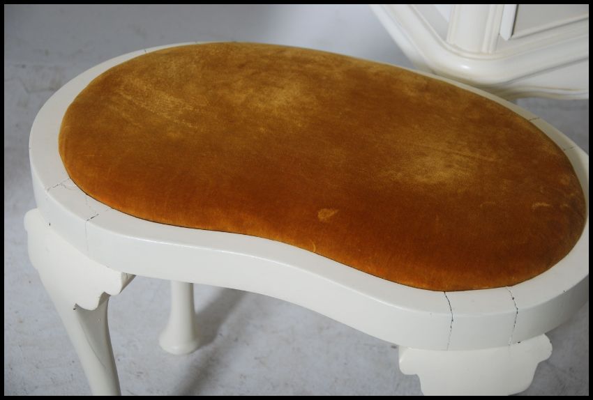 A Willis & Gambier painted Louis 16th style dressing table of kidney form raised on cabriole legs with a series of drawers either side of the kneehole recess. Complete with the stool. measures 78cm high x 127cm wide x 51cm deep.