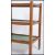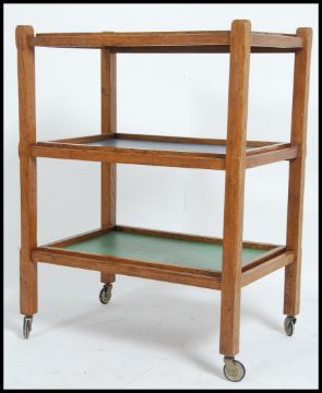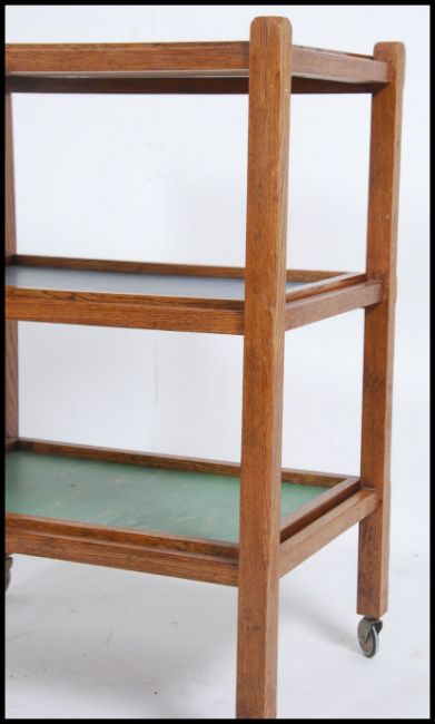 A vintage mid 20th century three tier tri colour oak drinks trolley having tapered legs raised on castors with yellow, blue and green and blue trays.