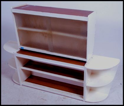 A set of two vintage mid 20th century kitchen wall units, sliding glazed doors with a series of shelves. Measures 92cm high x 135cm wide x 28cm deep.