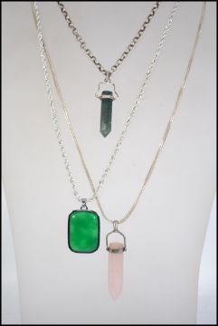 A group of three silver 925 necklace chains one being a rolo link chain with a moss agate stone crystal drop pendant, one being a foxtail link necklace chain with a pink quartz crystal drop pendant and the other being a rope twist chain with a green jade type cabochon pendant with dragon motif. Total weight 39 grams.